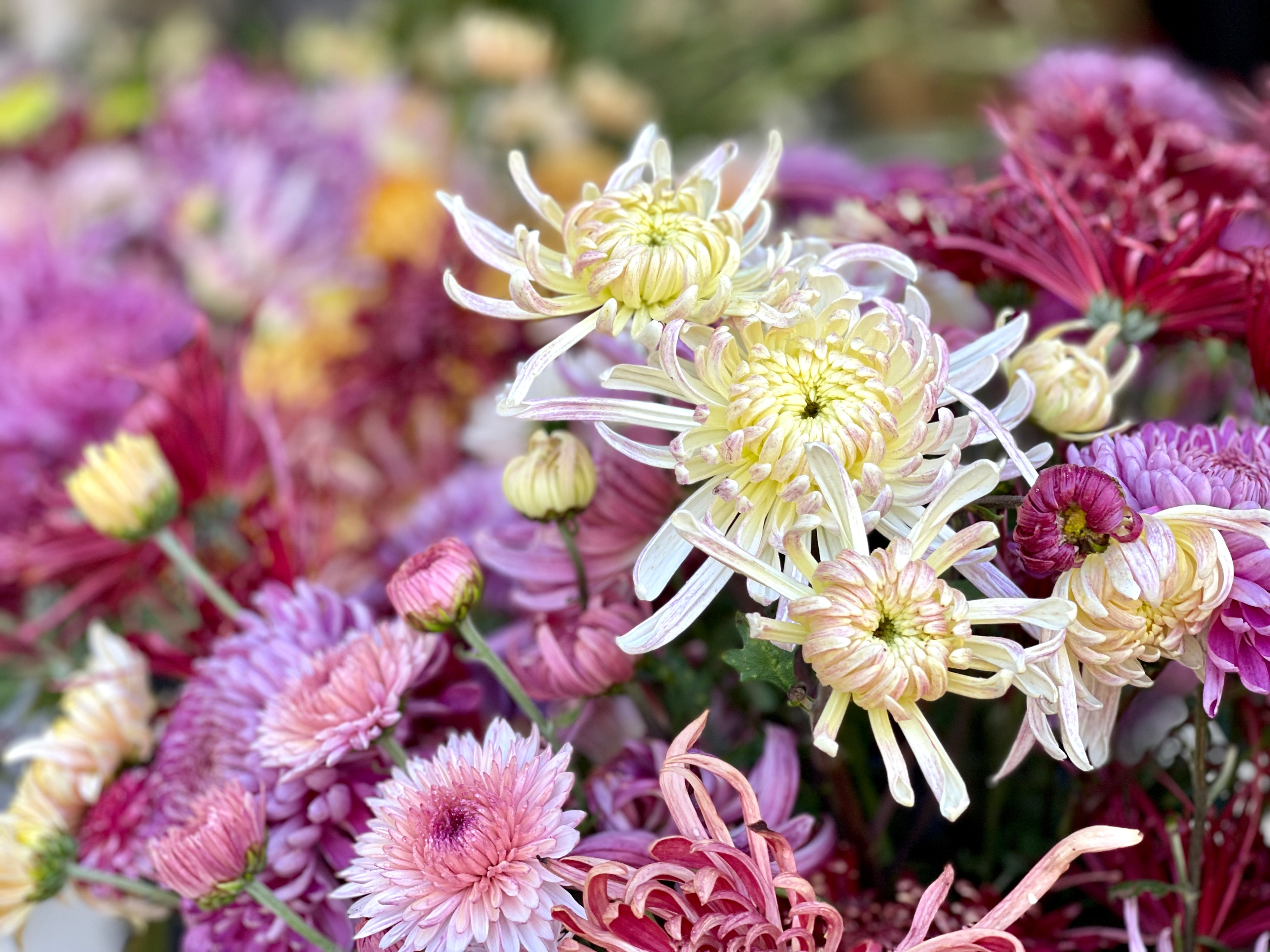 Chrysanthemums fill the flowering gap once the Dahlias finish, until temps get low enough that our season comes to an end. This is typically around Mother's Day, the perfect finish for our Chrysanthemums and our flowering season.