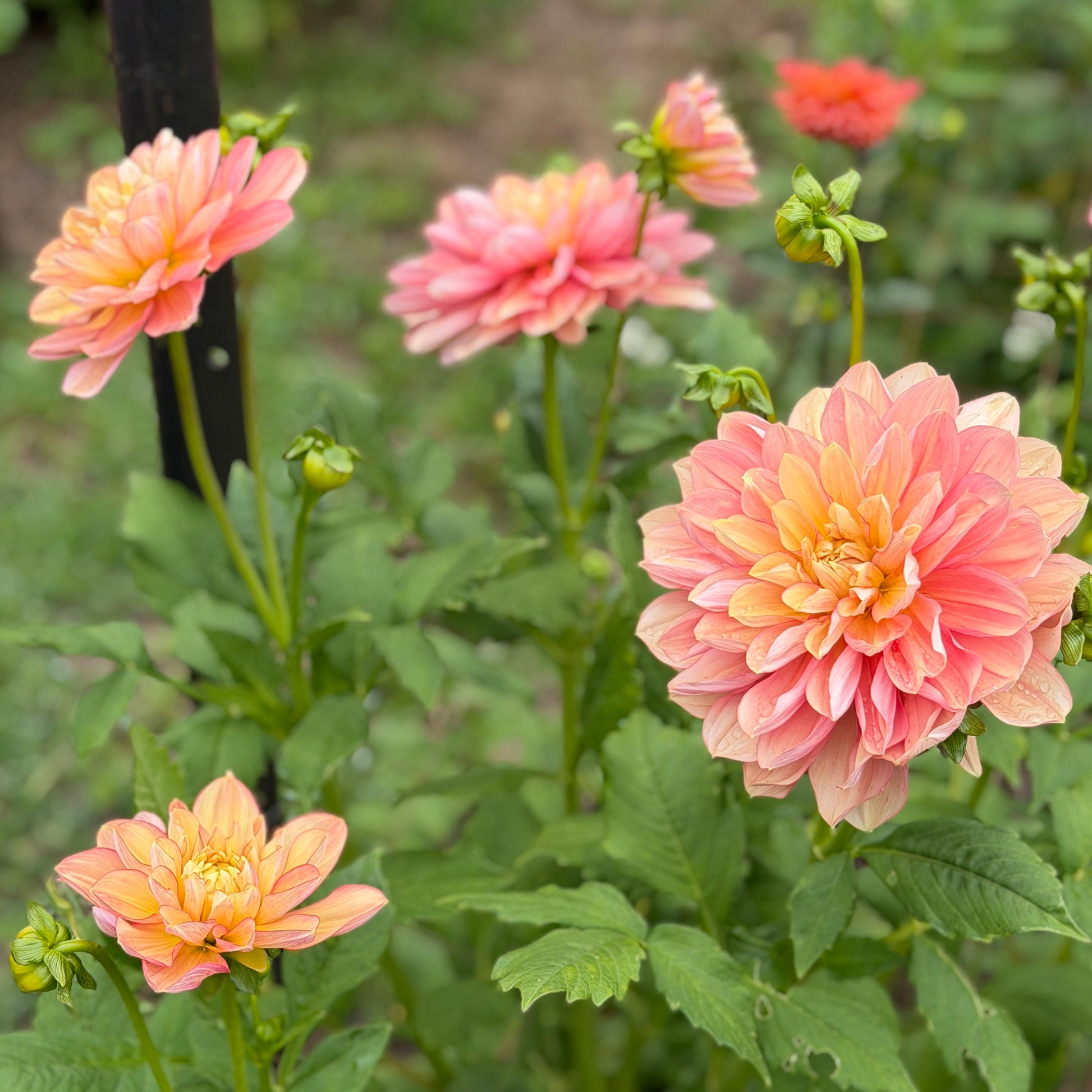 DESCRIPTION: Peach to apricot blooms with butter yellow centre and peachy pink reverse. While it is technically a Decorative, it is very close to a Water Lily type and falls into that category on my farm. Bred by Lorelie Merton of Florelie Seasonal Flowers.
